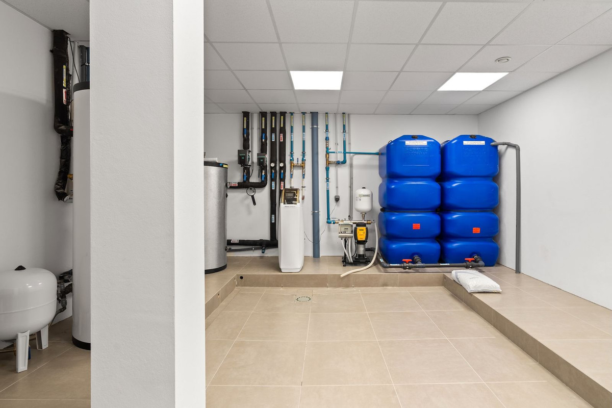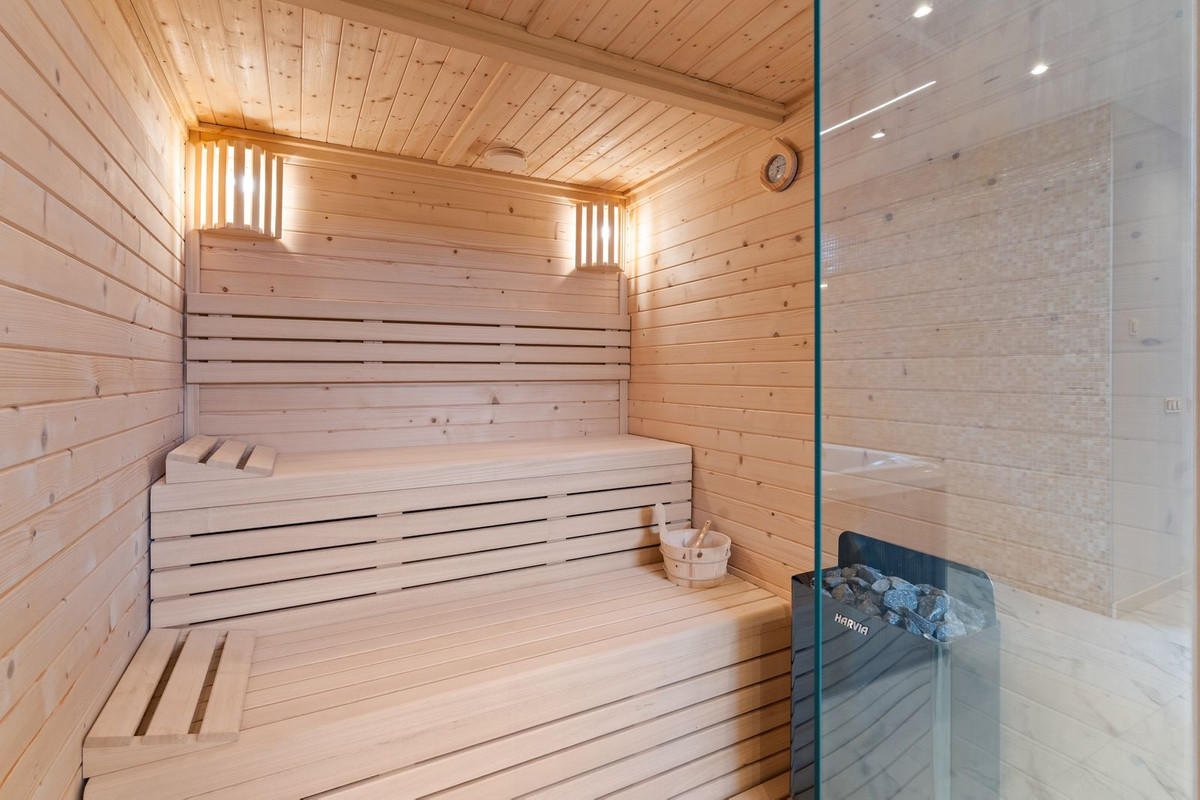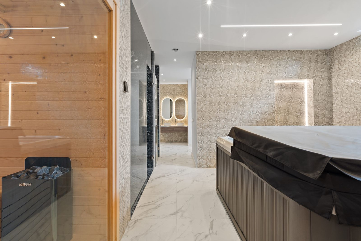 La planta inferior ha sido concebida pensando tanto en el confort como en el ocio, e incluye una zona de gimnasio, una zona de spa con sauna, jacuzzi y hammam, bodega, además de espacios destinados al entretenimiento. En este nivel se sitúan igualmente el alojamiento para el personal, zonas de almacenamiento y áreas de servicio. La vivienda está equipada con suelo radiante, sistemas avanzados de climatización, doble acristalamiento y chimenea. La eficiencia energética se ve reforzada mediante paneles solares fotovoltaicos con sistemas de baterías FVE y un sistema de agua caliente solar.
