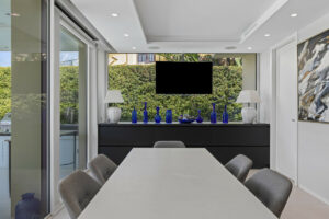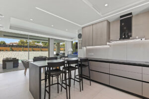 Un gran hall de entrada abierto conduce a las zonas de estar iluminadas con techos abovedados mejorados por iluminación especial, baldosas de gran formato y grandes ventanales que enmarcan el jardín circundante. La cocina de planta abierta es elegante y funcional, completa con un bar de desayunos, que conecta perfectamente con el comedor y los espacios vivos. El salón también se beneficia de una chimenea moderna de gas, creando un punto focal cálido y elegante.