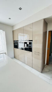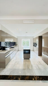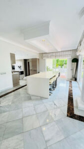 La cocina moderna de concepto abierto tipo americano, totalmente equipada, cuenta con una gran isla central y conecta directamente con el salón y el comedor, perfecta para el día a día y para recibir invitados.