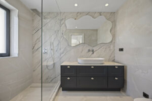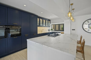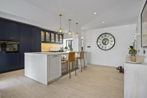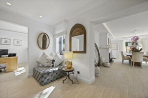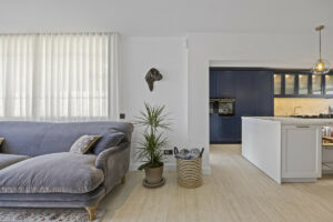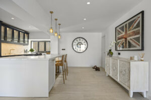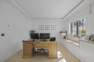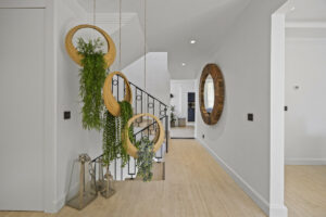 En la planta baja, una cocina de vanguardia con una elegante isla central y una barra de desayuno se conecta directamente a una terraza frontal cubierta, lo que lo hace ideal para cenar al aire libre. Un lavadero separado con un aseo privado conduce al jardín trasero. La zona de estar y comedor de planta abierta está bañada en luz natural y cuenta con una acogedora chimenea, con acceso directo a otra terraza cubierta. Este nivel también incluye un versátil dormitorio de invitados o oficina en casa con un baño en suite.