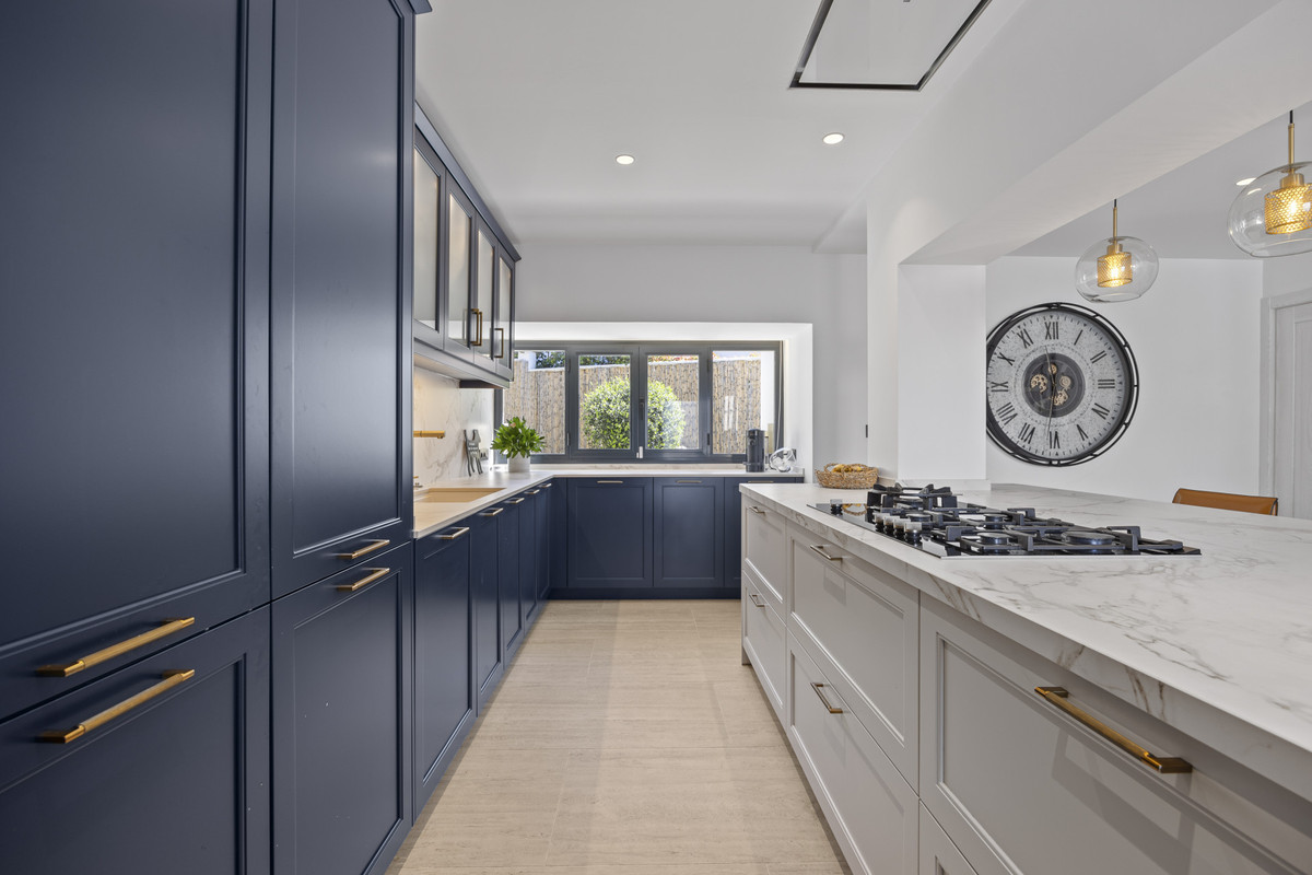 En la planta baja, una cocina de vanguardia con una elegante isla central y una barra de desayuno se conecta directamente a una terraza frontal cubierta, lo que lo hace ideal para cenar al aire libre. Un lavadero separado con un aseo privado conduce al jardín trasero. La zona de estar y comedor de planta abierta está bañada en luz natural y cuenta con una acogedora chimenea, con acceso directo a otra terraza cubierta. Este nivel también incluye un versátil dormitorio de invitados o oficina en casa con un baño en suite.