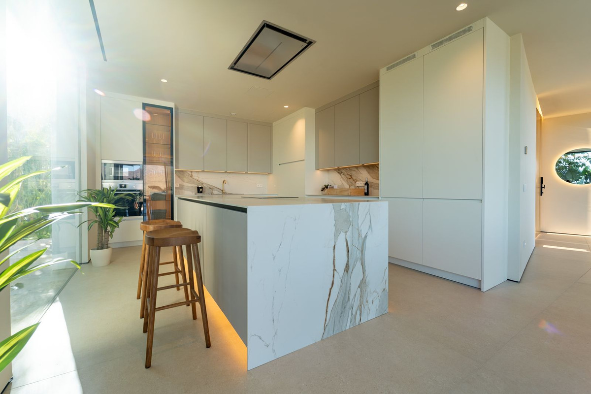 En la planta de entrada, un elegante salón con techos de doble altura, comedor y cocina de diseño totalmente equipada, además de un aseo de cortesía. Todas las estancias ofrecen impresionantes vistas panorámicas. La escalera flotante conduce a la primera planta.