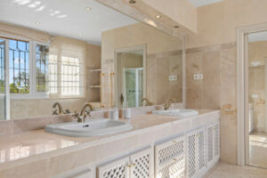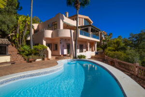 En una de las zonas más exclusivas y tranquilas de La Mairena, rodeada de naturaleza y con unas vistas al mar que enamoran desde el primer instante, se encuentra esta villa de grandes proporciones, privacidad absoluta y luz extraordinaria. Con 663 m2 construidos y distribuidos en tres plantas y 5 dormitorios en suite, es una propiedad a renovar que ofrece un potencial excepcional para crear una residencia verdaderamente extraordinaria.Desde el acceso principal, la sensación es clara: espacio, luz y vistas infinitas. Los techos altos, los ventanales de gran formato y las proporciones generosas en cada estancia crean un ambiente difícil de encontrar incluso en las villas más exclusivas. El gran salón, de dimensiones imponentes, se abre al horizonte mediterráneo a través de amplios ventanales que bañan la estancia en luz natural y conecta directamente con una amplia terraza que combina una zona acristalada y otra abierta, ambas con vistas realmente espectaculares. Unido al comedor, conforma un espacio perfecto para rediseñar en un concepto elegante, fluido y contemporáneo. La cocina independiente, amplia y luminosa, incluye despensa, lavandería y un cuarto adicional que puede adaptarse a múltiples usos según las necesidades. En la planta inferior se ubican dos dormitorios de gran tamaño, ambos con baño en suite; uno de ellos incorpora un generoso walk-in closet. Estos dormitorios disfrutan de acceso directo al jardín y la piscina, lo que crea un ambiente íntimo y perfectamente integrado con el exterior. En la planta principal, además de las zonas comunes, se encuentra una elegante oficina con balcón privado y vistas panorámicas, un espacio único para trabajar sintiendo el Mediterráneo frente a ti. En la planta superior, dos dormitorios adicionales en suite cuentan con amplias terrazas privadas que ofrecen vistas espectaculares al mar, convirtiéndose en verdaderos refugios de paz y luz.La parcela de 1.343 m2 invita a disfrutar la vida al aire libre durante todo el año. Los jardines maduros, la piscina con zona de descanso y cocina exterior y el gran patio con zona de barbacoa crean un conjunto ideal para quienes buscan privacidad, naturaleza y vistas incomparables.La villa cuenta con garaje privado, ascensor con acceso a cada una de las plantas, calefacción por suelo radiante en toda la casa, sistema de alarma, descalcificador de agua y múltiples posibilidades de redistribución para adaptarla a los estándares contemporáneos más exigentes.Su ubicación añade aún más valor: en un enclave verde y tranquilo de la Costa del Sol, junto al Colegio Alemán y Echos International School, a solo 10 minutos de supermercados, restaurantes y servicios de Elviria y del Santa María Golf Club, y a 17 minutos del centro de Marbella.Una villa con carácter, luz y un entorno privilegiado, ideal para quienes buscan un hogar que combine tranquilidad, naturaleza y la posibilidad de crear un espacio verdaderamente personal y exclusivo.Tiene a su disposición el documento informativo abreviado. Gastos: Impuestos (ITP o IVA+AJD) + Gastos notariales y registrales. ALA