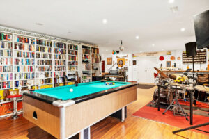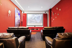 La planta inferior está dedicada al ocio y al servicio, elevando la experiencia de vivir la casa: sala de cine privada, zona de juegos con bar, bodega y alojamiento para servicio con kitchenette.
