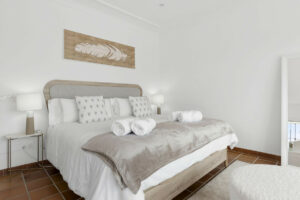 Subiendo la escalera, se revelan dos dormitorios adicionales, cada uno de los cuales rebosa comodidad y elegancia. La suite principal cuenta con un cuarto de baño privado con una lujosa bañera y ducha, acompañado de una amplia terraza privada con vistas al mar. El cuarto dormitorio ofrece un acogedor refugio con una cama doble y una coqueta zona de estar con sofá.