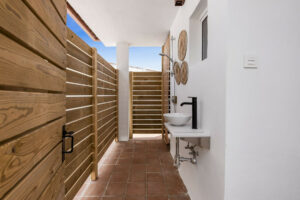 Al cruzar las puertas de madera, los huéspedes son recibidos en un exquisito vestíbulo adornado con una escalera y techos altos. A la izquierda se encuentra el primer dormitorio, con cama de matrimonio y cuarto de baño privado. El segundo dormitorio, con dos camas individuales, también dispone de cuarto de baño privado. En el lado opuesto, la cocina y el comedor se abren con amplios ventanales, fusionando a la perfección el interior y el exterior. Desde aquí se accede a la amplia terraza cubierta, que cuenta con una mesa de comedor y una acogedora zona de estar perfecta para reunirse en los días calurosos y soleados.