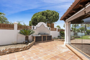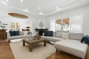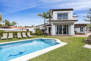 Enclavada en la serena Playa de Las Chapas, a tan sólo 300 metros de la playa, se encuentra esta impresionante villa de 5 dormitorios y 5,5 baños. Esta idílica propiedad está convenientemente situada a sólo 5 minutos en coche del centro de Marbella y a 40 minutos del aeropuerto de Málaga, lo que garantiza tanto la accesibilidad como la tranquilidad.