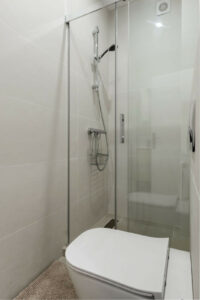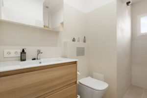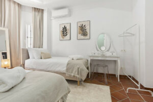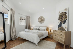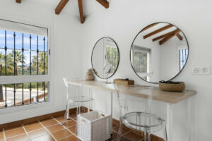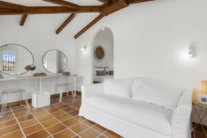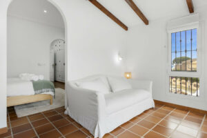 Subiendo la escalera, se revelan dos dormitorios adicionales, cada uno de los cuales rebosa comodidad y elegancia. La suite principal cuenta con un cuarto de baño privado con una lujosa bañera y ducha, acompañado de una amplia terraza privada con vistas al mar. El cuarto dormitorio ofrece un acogedor refugio con una cama doble y una coqueta zona de estar con sofá.