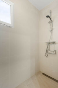 Al cruzar las puertas de madera, los huéspedes son recibidos en un exquisito vestíbulo adornado con una escalera y techos altos. A la izquierda se encuentra el primer dormitorio, con cama de matrimonio y cuarto de baño privado. El segundo dormitorio, con dos camas individuales, también dispone de cuarto de baño privado. En el lado opuesto, la cocina y el comedor se abren con amplios ventanales, fusionando a la perfección el interior y el exterior. Desde aquí se accede a la amplia terraza cubierta, que cuenta con una mesa de comedor y una acogedora zona de estar perfecta para reunirse en los días calurosos y soleados.