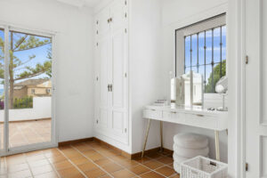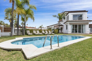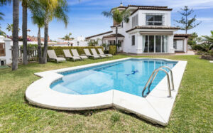 Enclavada en la serena Playa de Las Chapas, a tan sólo 300 metros de la playa, se encuentra esta impresionante villa de 5 dormitorios y 5,5 baños. Esta idílica propiedad está convenientemente situada a sólo 5 minutos en coche del centro de Marbella y a 40 minutos del aeropuerto de Málaga, lo que garantiza tanto la accesibilidad como la tranquilidad.