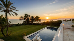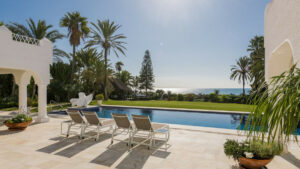 La villa, edificada en un emplazamiento privilegiado junto a la playa –algo que hoy en día ya no puede replicarse–, se distingue por ofrecer las vistas más espectaculares y una experiencia personal inigualable de mar, cielo, playa y privacidad. Todo ello rodeado por extensos jardines meticulosamente cuidados que envuelven la propiedad con una rica variedad de tonos, texturas y fragancias florales y marinas, acompañadas por la melodía del mar. No solo es un lugar de extraordinaria belleza, sino también de gran intimidad, delimitado únicamente por otras grandes propiedades con amplios jardines.