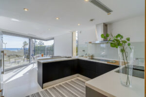 La cocina, de diseño minimalista y totalmente equipada, se integra con el comedor y la zona de estar, ideal para disfrutar del estilo de vida marbellí durante todo el año.