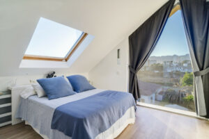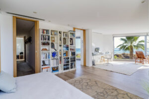 En la planta superior, la suite principal ofrece un refugio privado con vistas al Mediterráneo, acceso directo a la terraza y baño en suite. Cada habitación ha sido pensada para maximizar la conexión con el entorno, con un diseño luminoso, relajado y sofisticado.