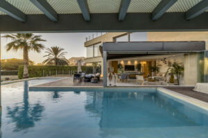 Diseñada con líneas limpias y materiales naturales, la propiedad combina elegancia moderna con el confort mediterráneo. Sus amplios ventanales panorámicos permiten que la luz inunde cada espacio y ofrecen vistas abiertas al mar desde casi todas las estancias.