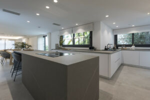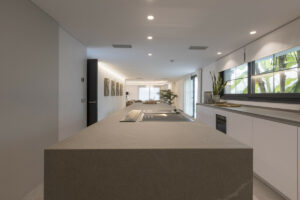 La casa dispone de una espaciosa sala de estar de diseño abierto que se fusiona con la cocina, creando un ambiente acogedor y familiar. La cocina está equipada con electrodomésticos de alta gama y cuenta con una sala de vinos con una puerta de cristal. Además, hay una sala de TV y otro dormitorio con baño en suite. Un dormitorio de servicio con baño privado completa la distribución principal.