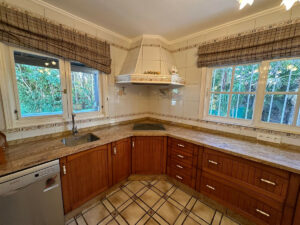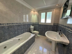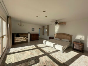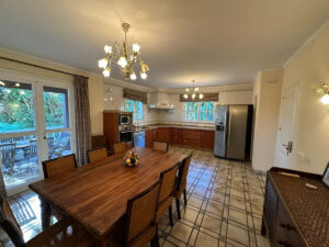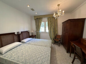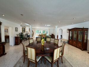 La distribución de la villa incluye 5 dormitorios y 5 baños, de los cuales dos son en suite, proporcionando el máximo confort y privacidad para todos los miembros de la familia o invitados. El salón principal cuenta con chimenea y se conecta tanto con el comedor como con una cocina completamente equipada y una práctica kitchenette adicional. Los espacios interiores se completan con un sótano, un vestidor, armarios empotrados y un trastero que facilitan el almacenaje y organización. Los acabados incluyen suelos de porcelana y modernas puertas de cristal, mientras que el aire acondicionado asegura un ambiente perfecto durante todo el año.
