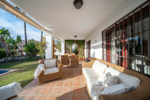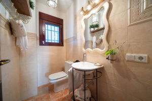 Amplio salón con salida directa al porche cubierto, al jardín y a la piscina privada, perfecto para disfrutar del clima de la Costa del Sol. La cocina independiente, muy espaciosa y luminosa, cuenta con salida a la parte trasera de la vivienda, ideal para comidas al aire libre. En esta planta también hay un aseo de cortesía.