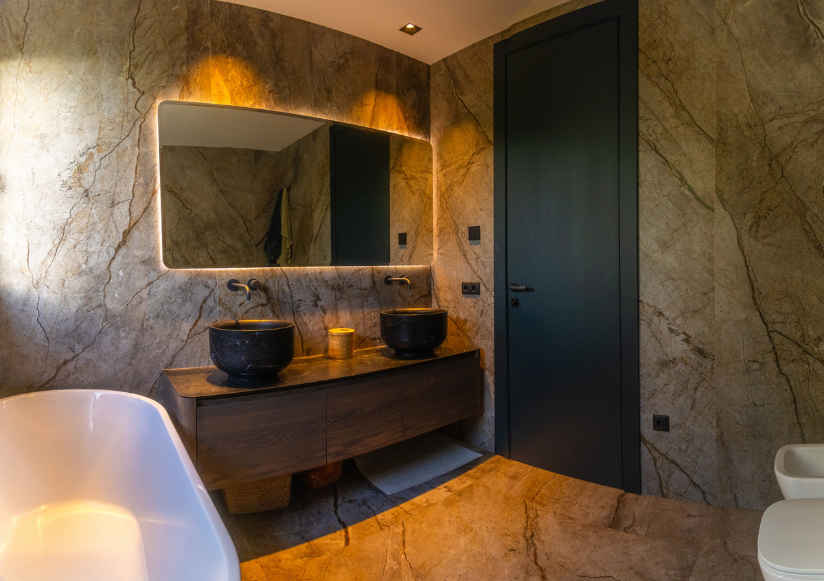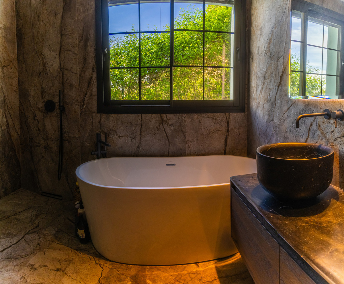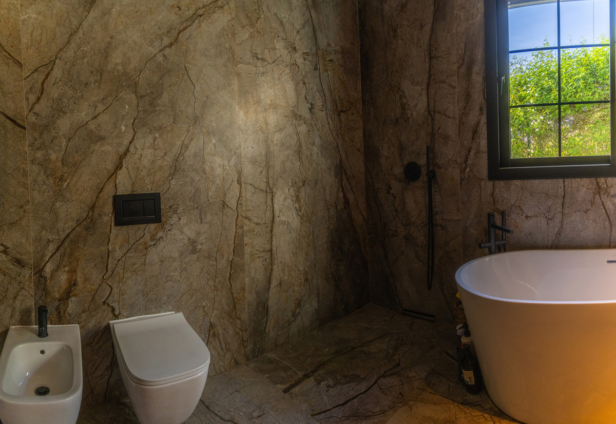 Esta villa cuenta con acabados superiores, incluyendo detalles en piedra natural, una escalera Porcelanosa y suelos cerámicos de alta gama. Las ventanas de doble acristalamiento con cámara de argón y cristal Guardian Sun garantizan un aislamiento y eficiencia energética óptimos.