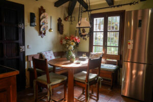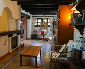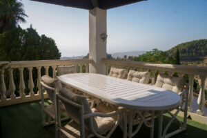 En el interior, la villa muestra la artesanía clásica española, con vigas de madera vistas, detalles hechos a mano y un gran salón con techos altos y una chimenea acogedora. Las grandes ventanas y las múltiples terrazas inundan la casa de luz natural, creando una conexión fluida entre los espacios interiores y exteriores.