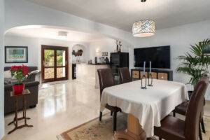 Una distribución amplia y acogedora que incluye dos cómodos salones: uno de ellos con comedor y una pequeña barra, y otro con chimenea. Además, dispone de un comedor adicional que comunica directamente con la zona de la piscina y la terraza, creando una perfecta conexión interior–exterior ideal para el entretenimiento. Una gran cocina independiente completa esta planta.