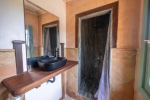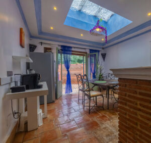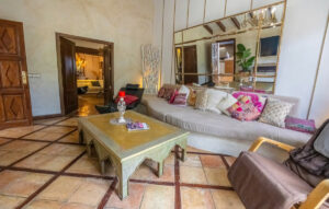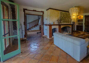 La villa está completamente amueblada y cuenta con un amplio salón con chimenea, que crea un ambiente cálido y confortable. Grandes puertas correderas dan a una terraza cubierta privada con vistas a las montañas y al jardín paisajístico, un espacio perfecto para relajarse o cenar al aire libre.