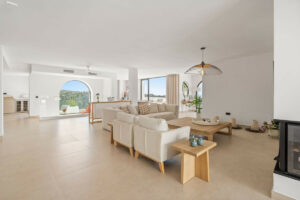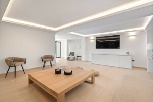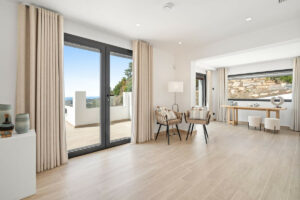 En el interior, el salón irradia una grandeza discreta, con una gran mesa de comedor y ventanales que abrazan el horizonte. La cocina de concepto abierto, completamente equipada con electrodomésticos de alta gama, ofrece un amplio espacio de almacenaje y acabados exquisitos para satisfacer a los más exigentes gourmets.