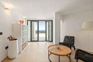 Una de las particularidades de esta propiedad son sus dos accesos independientes. La primera entrada, situada junto al trastero, conduce a un espacio versátil que puede utilizarse como oficina o sala de juegos. Desde aquí se accede a tres dormitorios en suite, cada uno con su propio carácter. Dos de ellos disfrutan de espectaculares vistas al mar y las montañas, mientras que el tercero ofrece una vista idílica a zonas verdes y colinas onduladas – un auténtico refugio para quienes buscan paz y serenidad.
