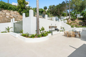El segundo acceso a la villa se encuentra en el lado opuesto de la parcela. Una encantadora escalera exterior conduce a una cocina exterior totalmente equipada con comedor – ideal para cenas refinadas bajo las estrellas. En este mismo nivel se encuentra la entrada principal y la espectacular piscina infinita – una auténtica obra arquitectónica con vistas de ensueño al mar, las montañas y el animado puerto de Puerto Banús.