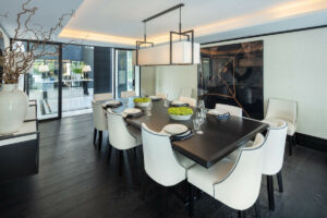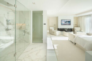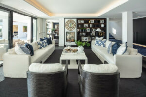 En el nivel principal se encuentra un salón de planta abierta que se comunica con el comedor y la cocina. Este espacio, pensado tanto para el día a día como para ocasiones especiales, cuenta con acceso directo al exterior y vistas panorámicas. La cocina está equipada con tecnología moderna y acabados cuidadosamente seleccionados. La suite principal, con vistas al mar, dispone de vestidor y baño privado.
