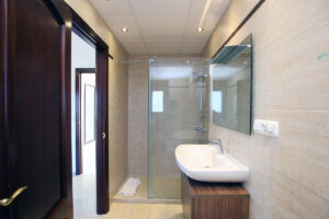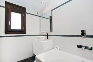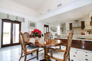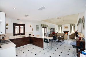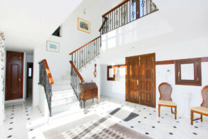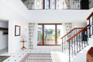 Al entrar en la villa, la impresión inmediata es de espacio y luz. El hall de entrada tiene ventanas de cristal del suelo al techo que dan directamente al jardín y a la piscina. Una gran escalera de hierro forjado y madera con una galería de aterrizaje por encima es un impresionante punto focal a la casa. El pasillo es grande y también podría ser utilizado como una pequeña sala de recepción.