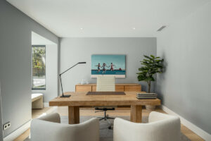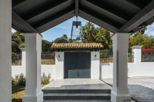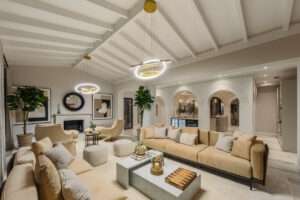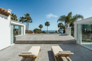 En el interior, la villa realza la sofisticación con su elegante uso de tonos naturales y acabados de alta calidad. La amplia sala de estar se destaca por los techos altos con vigas de madera pintadas de blanco, que realzan el encanto andaluz de la villa. Este espacio fluye perfectamente hacia la terraza exterior, que incluye una acogedora zona de salón, una mesa de comedor y una zona de barbacoa, ofreciendo un ambiente maravilloso para cenar al aire libre.