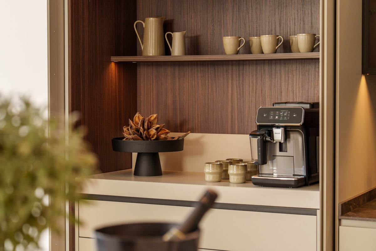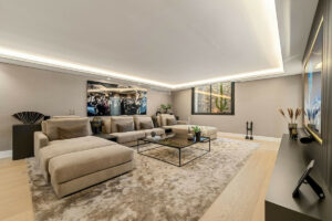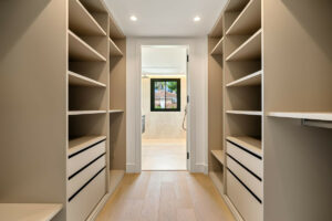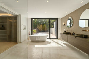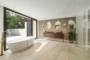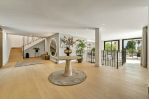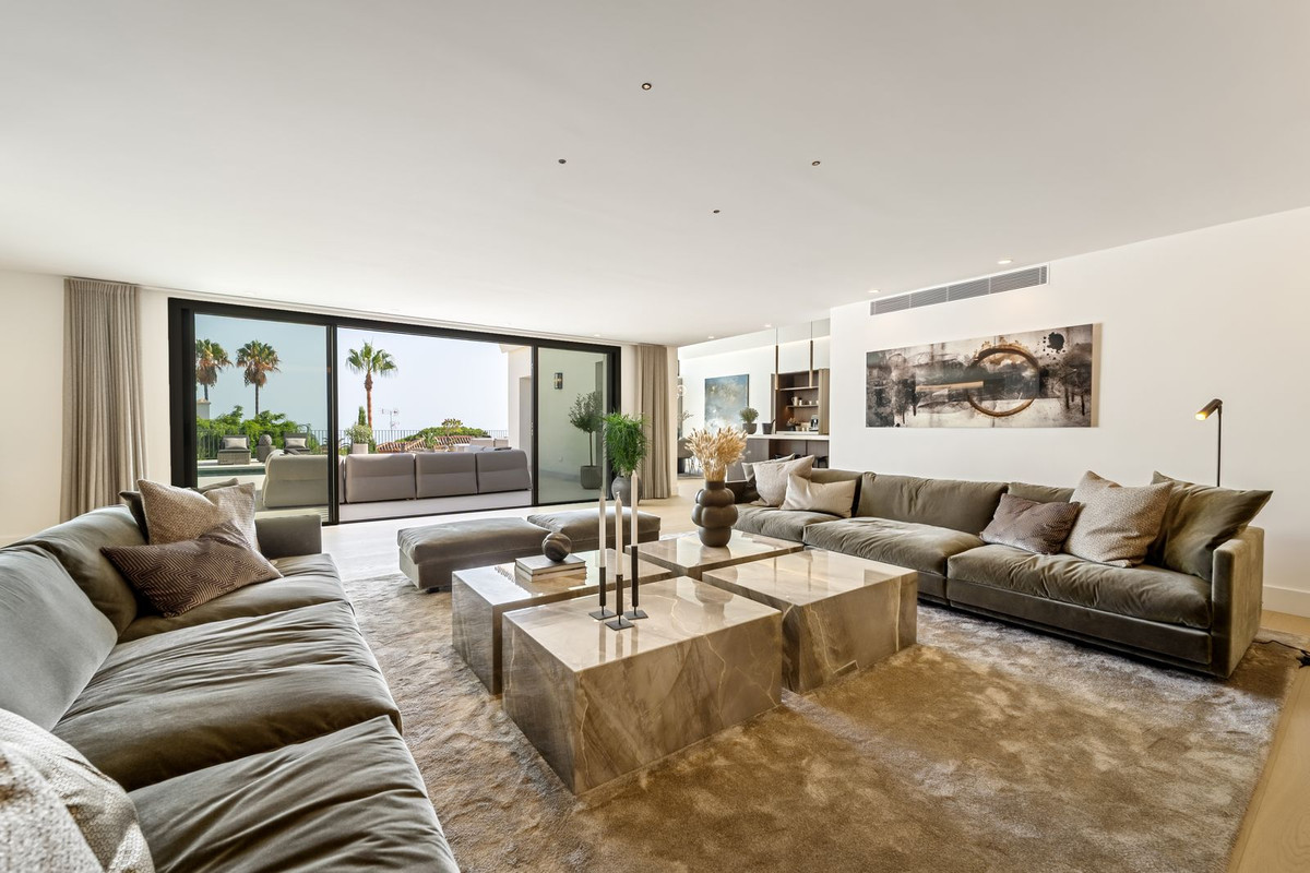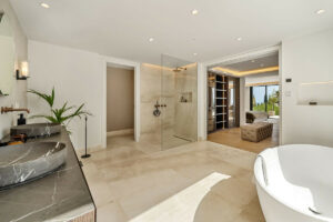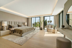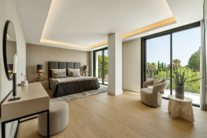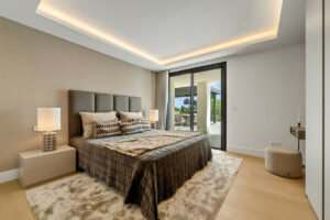 El espacio principal está compuesto por un amplio salón y comedor de planta abierta que giran en torno a una cocina de diseño con isla central. La villa dispone de cinco suites de dormitorio, entre ellas una suite principal con terraza privada, vistas panorámicas al mar y un vestidor de diseño abierto.