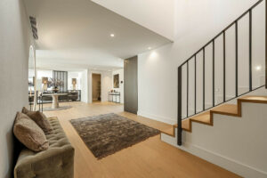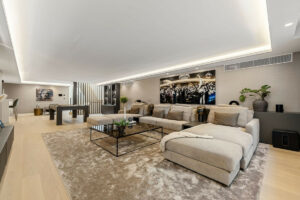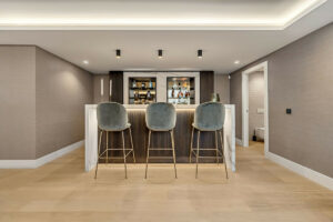 La planta inferior está pensada para el entretenimiento, con un elegante salón con bar, bodega acristalada y mesa de billar, además de dos aseos de cortesía y generosas zonas de almacenamiento.