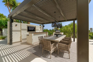En el exterior, 456 m² de terrazas rodean una gran piscina de agua salada, solárium, jardines paisajísticos y un área de comedor al aire libre. Tras la entrada privada con portón, un porche cubierto ofrece capacidad para seis vehículos.