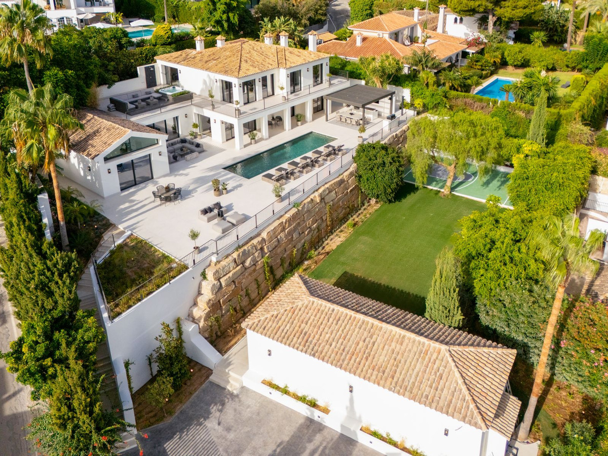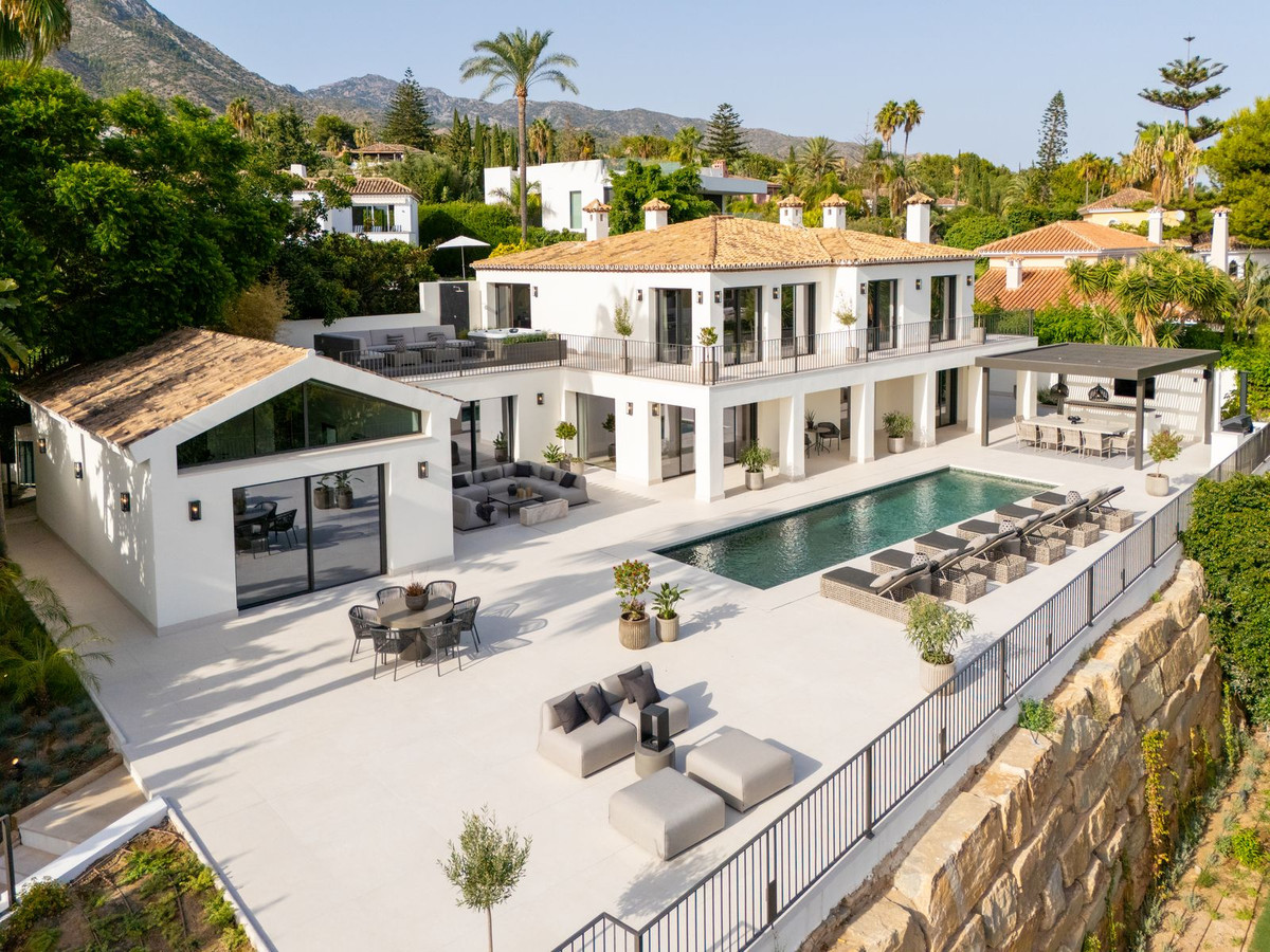 Esta villa de estilo andaluz, completamente renovada, se encuentra en Rocío de Nagüeles, una de las zonas más exclusivas de la Milla de Oro de Marbella. Ubicada en una parcela orientada al sur de 1.965 m², a los pies de La Concha, disfruta de amplias vistas al mar Mediterráneo. Modernizada en 2025, la residencia ofrece 734 m² de interiores luminosos donde los techos altos, los ventanales de suelo a techo y las transiciones fluidas entre interior y exterior potencian la conexión con el entorno.