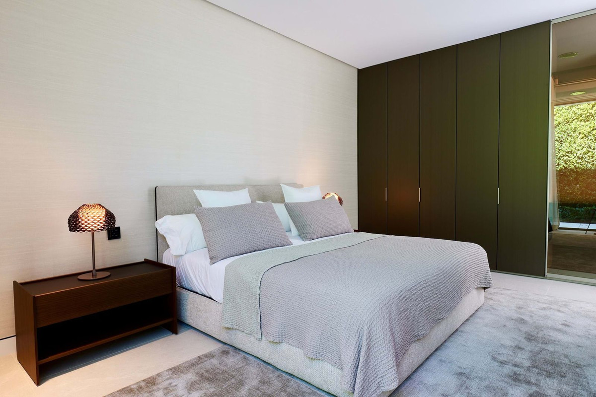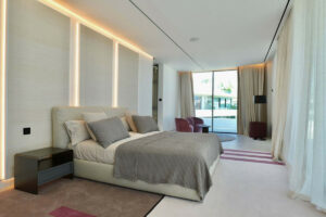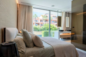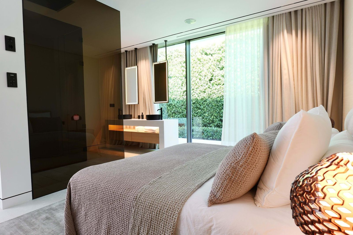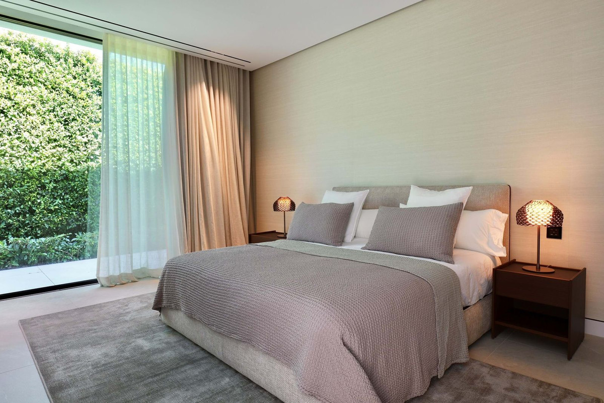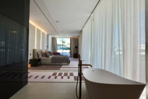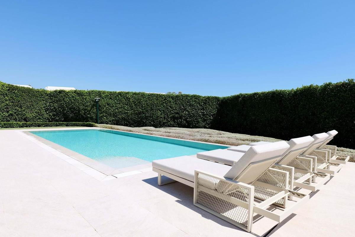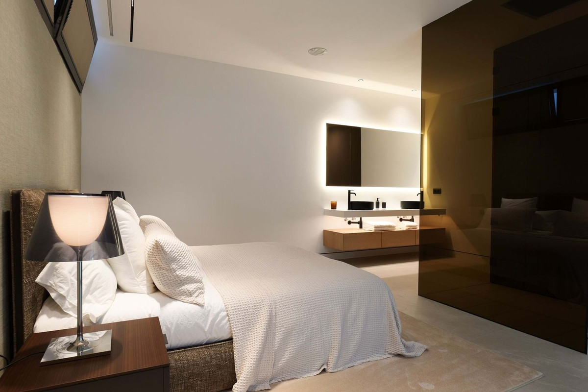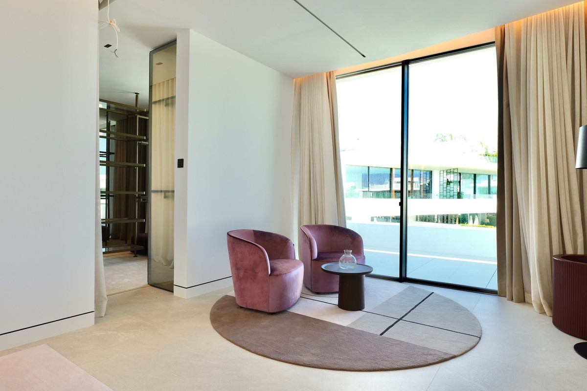 La villa cuenta con cinco amplios dormitorios, cada uno con baño en suite y terraza privada. La suite principal se convierte en un auténtico santuario con vestidor y abundante luz natural.