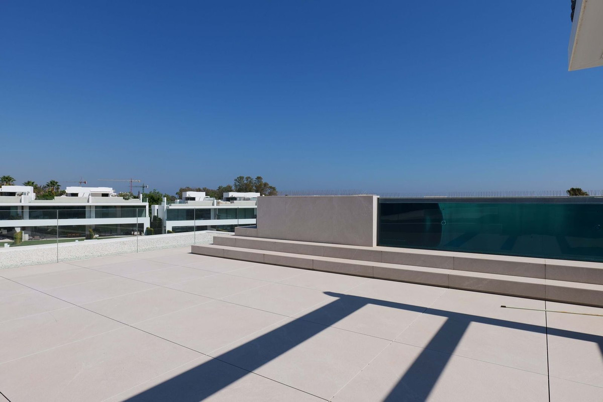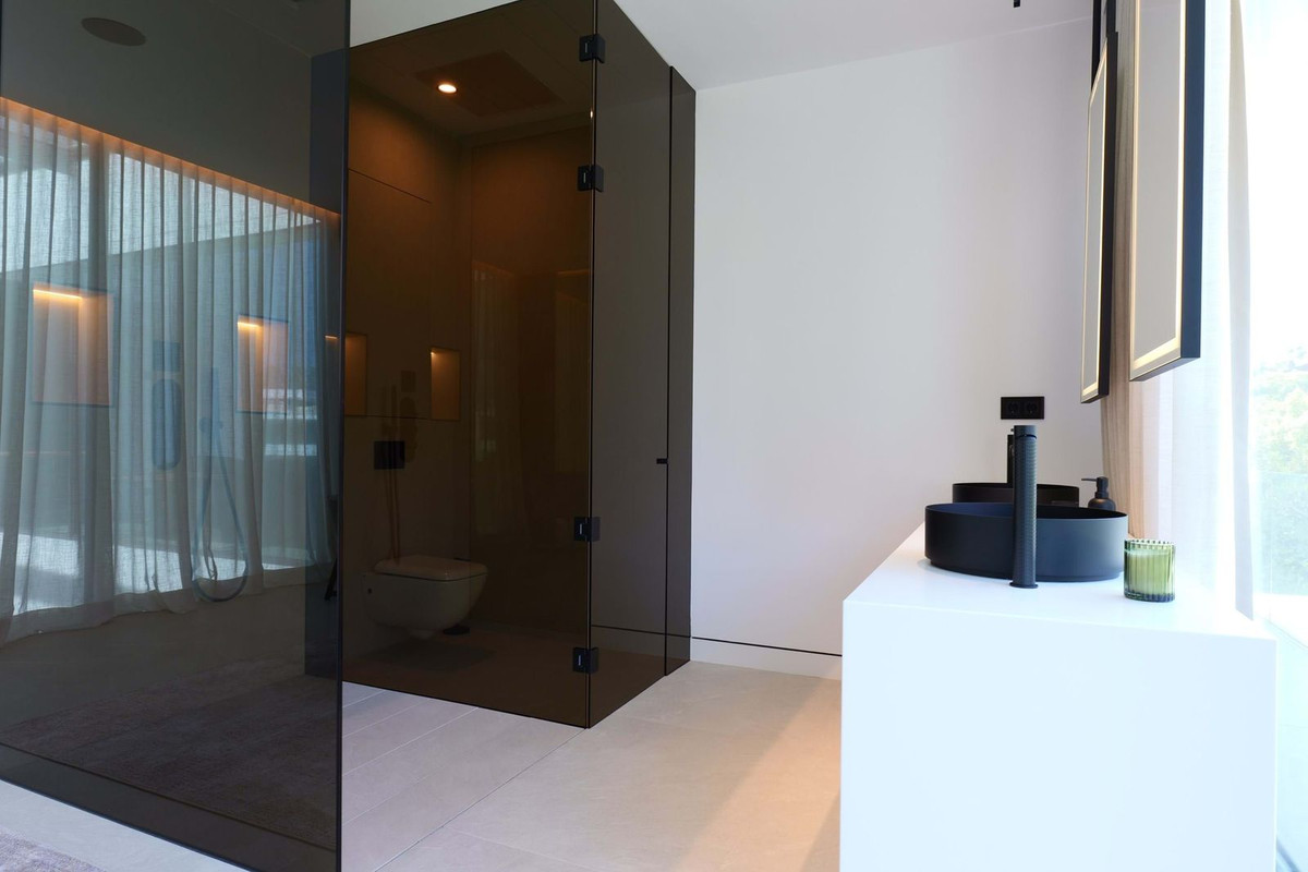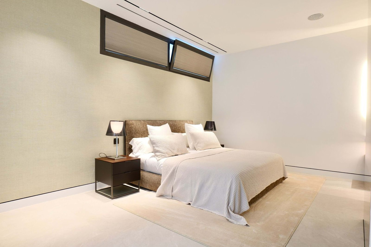 En la planta superior, tres dormitorios con terrazas privadas disfrutan de vistas panorámicas al mar y a la montaña. El sótano alberga una sala de cine, un bar, una sala multiusos, una suite de invitados, una zona de lavandería, un trastero y un garaje con capacidad para ocho coches. Destaca el solárium de 100 m² en la azotea con piscina, comedor y zonas de estar, que ofrece inmejorables vistas al Mediterráneo. Las comodidades modernas incluyen calefacción por suelo radiante, domótica, sonido Dolby Surround y seguridad avanzada.