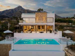 Esta excepcional residencia contemporánea, situada en el prestigioso Marbella Hill Club a pocos minutos de la Milla de Oro, encarna la sofisticación moderna y la excelencia arquitectónica. Diseñada por Villaroel y construida por B Solís, combina armoniosamente piedra natural, vidrio y líneas geométricas puras en tres niveles, rodeada por exuberantes jardines paisajísticos diseñados por Esspora. El resultado es un refugio sereno que equilibra privacidad, amplitud y belleza escénica.