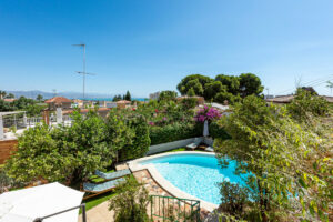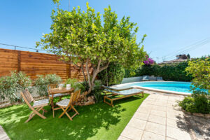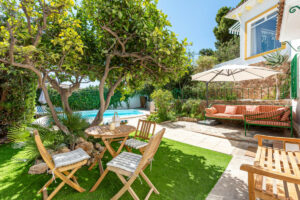 El exterior de la villa es un verdadero deleite y se presenta como un oasis privado, rodeado de una gran variedad de plantas y árboles que transmiten frescura y tranquilidad. El jardín bien cuidado envuelve la piscina privada, creando un lugar perfecto para relajarse y disfrutar del sol. Numerosos espacios exteriores, llenos de encanto, incluyen una terraza abierta, ideal para almuerzos al aire libre o cenas bajo las estrellas, y un área de barbacoa que promete momentos inolvidables con familia y amigos.