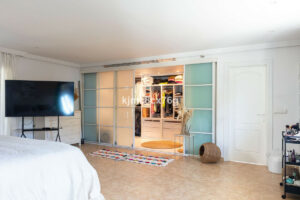 En la planta baja se encuentra un apartamento independiente ideal para invitados. Cuenta con dos dormitorios con armarios empotrados, un baño completo con ducha a ras de suelo, cocina equipada y un salón-comedor con chimenea. Las ventanas de gran formato se abren al jardín, permitiendo la entrada de luz natural y una agradable sensación de amplitud. La vivienda principal recibe con un hall elegante que da paso a un salón amplio y luminoso, con techos altos, chimenea central y ventanales panorámicos. En esta misma planta se encuentra el dormitorio principal con vestidor y baño en suite, equipado con jacuzzi y ducha, además de un aseo de cortesía. La cocina, con isla central, está completamente equipada y se abre mediante ventanales correderos a una gran terraza exterior. Esta zona conecta con la piscina, el porche cubierto y un espacio chill-out cerrado con cocina exterior y barbacoa, perfecto para disfrutar todo el año.