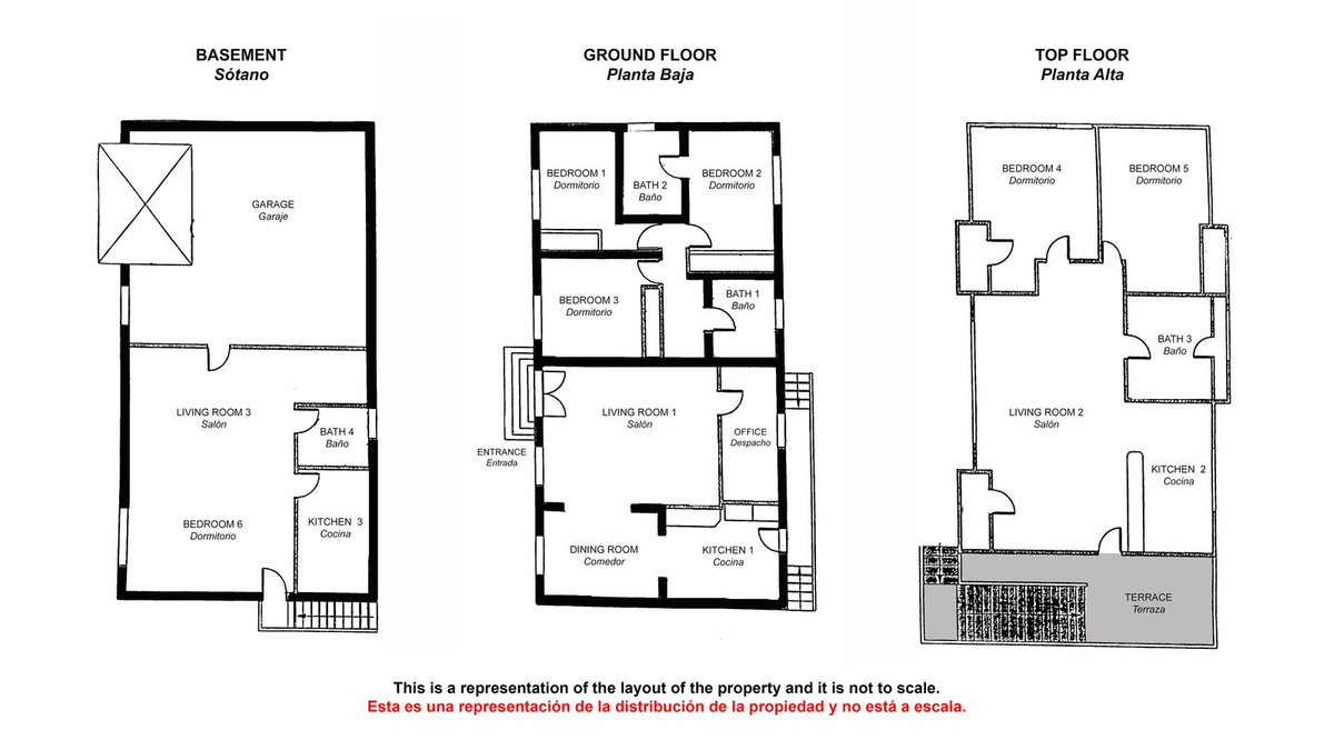 La planta baja cuenta con un amplio salón con chimenea, cocina-comedor, 4 dormitorios (el principal con baño en suite) y un baño de invitados. Un porche cubierto ofrece una estupenda zona de comedor adicional con vistas a la bahía de Málaga.