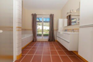 The hallway runs around the central courtyard, which can be opened for natural ventilation. The master bedroom is generously sized, with direct access to the terrace and garden, a walk-in dressing room, and an en-suite bathroom with bath, walk-in shower, and garden access. Two family bedrooms share a bathroom with walk-in shower, and the fourth bedroom has fitted wardrobes and its own en-suite with walk-in shower.