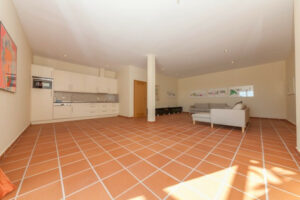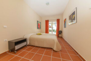 The independent guest apartment has its own entrance and also connects to the garage. Inside, there is a hallway leading to an open-plan living and dining room with fitted kitchen and access to the garden and pool. The apartment has two double bedrooms, both with fitted wardrobes and doors to the garden, sharing a bathroom and separate WC. There is also a large gym or family room and two storage rooms.