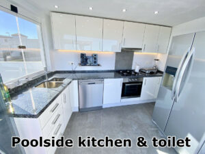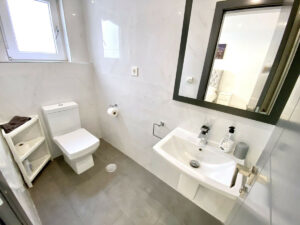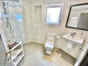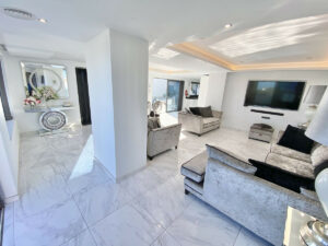 Esta impresionante villa de 5 dormitorios y 5 baños en venta en Benalmádena Pueblo también ofrece una zona independiente, actualmente utilizada como apartamento de 1 dormitorio, y ha sido completamente reformada con materiales de alta calidad. La villa ofrece un amplio salón-comedor con una moderna moldura, iluminación oculta y focos. Esta encantadora sala de estar ofrece abundante luz natural gracias a sus tres grandes puertas correderas que dan a la zona de entretenimiento y a la piscina. Moderna cocina abierta, blanca de alto brillo, equipada con armarios bajos y altos que incorporan electrodomésticos Bosch de lujo, incluyendo dos hornos, microondas y cafetera. Encimera de lujo de granito oscuro y salpicaderos con fregadero empotrado, gran placa de gas Bosch y campana extractora. Ventana con vistas a la piscina y al mar, con una moderna moldura con iluminación oculta y focos. Aseo y escaleras al rellano de la primera planta.