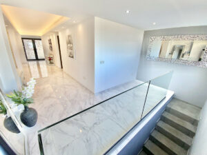 Impresionante rellano de la primera planta que da a los 5 dormitorios, con grandes puertas dobles que dan a la zona de estar y a los jardines y un amplio ventanal panorámico con preciosas vistas al mar. Impresionante dormitorio principal con amplio vestidor y puertas que dan a una magnífica terraza con preciosas vistas panorámicas al mar. El dormitorio principal también cuenta con un amplio baño en suite con bañera y una amplia ducha a ras de suelo. Hay cuatro dormitorios dobles más con modernas molduras e iluminación oculta o focos. Cada dormitorio tiene su propio baño en suite. La propiedad también cuenta con ventanas y puertas de doble acristalamiento de alta calidad, aire acondicionado e impresionantes vistas panorámicas al mar.