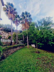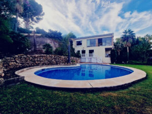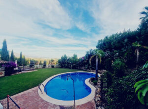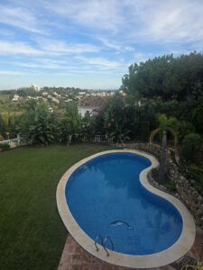 La villa cuenta con 2.000 m² de parcela, piscina, amplio jardín y huerto con aguacates y limoneros. Su posición elevada ofrece vistas al golf, las montañas y el mar.