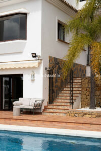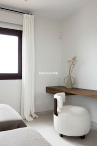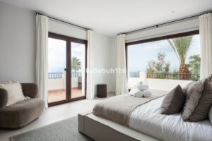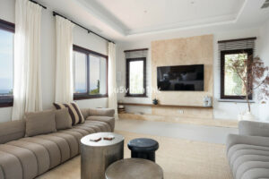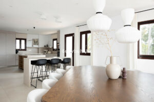 En el interior, la arquitectura revela un juego armonioso de luz y espacio. La luz del sol inunda los amplios ventanales, acentuando los altos techos y enmarcando las espectaculares vistas al Mediterráneo. Cada estancia está amueblada con piezas de diseño elegidas por su artesanía y elegancia atemporal. Dos chimeneas de bioetanol—en el salón y en la suite principal—aportan un resplandor suave y cálido, añadiendo intimidad a la arquitectura contemporánea.