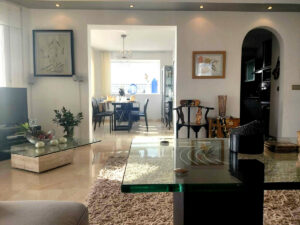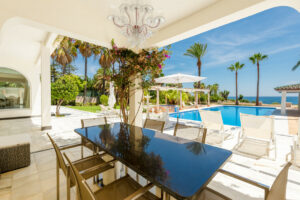 La villa de 664 m2 construidos cuenta con un elegante salón con techo en doble altura y acceso directo a las amplias terrazas y al impresionante jardín rodeado de palmeras.
