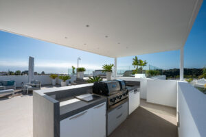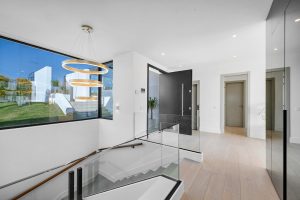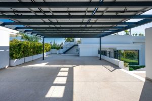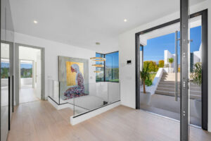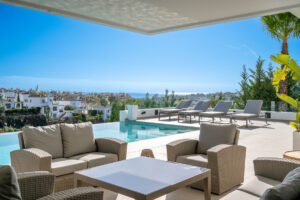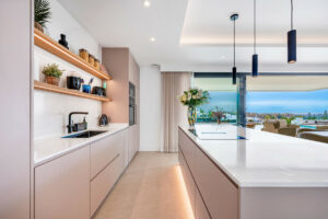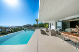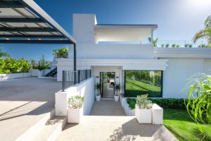 Una entrada privada conduce a la entrada de la planta superior, donde las vistas panorámicas del Mediterráneo y el campo de golf La Resina ponen inmediatamente el tono. Las líneas arquitectónicas limpias, la abundante luz natural y la geometría llamativa crean una primera impresión impresionante.