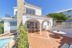 La villa esta divida en dos. Una es la casa principal la cual ofrece 4 dormitorios y 3 baños, una cocina estilo moderno y un luminoso salón que da salida a una terraza techada y a la piscina.